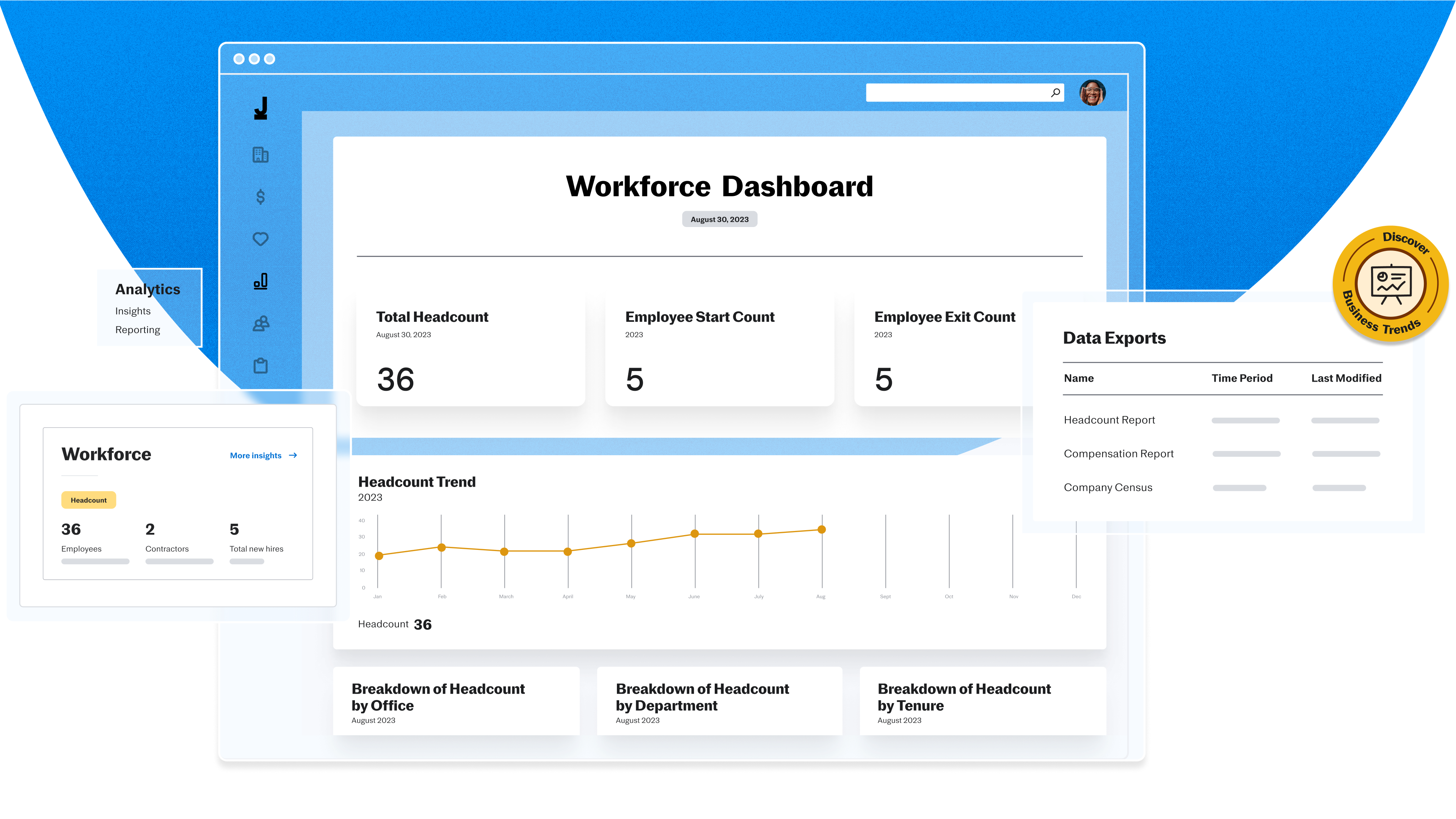 Manage workforce data in one place: People Analytics combines your people and business data in a single source of truth for key metrics such as headcount, turnover, compensation, time off, and more.